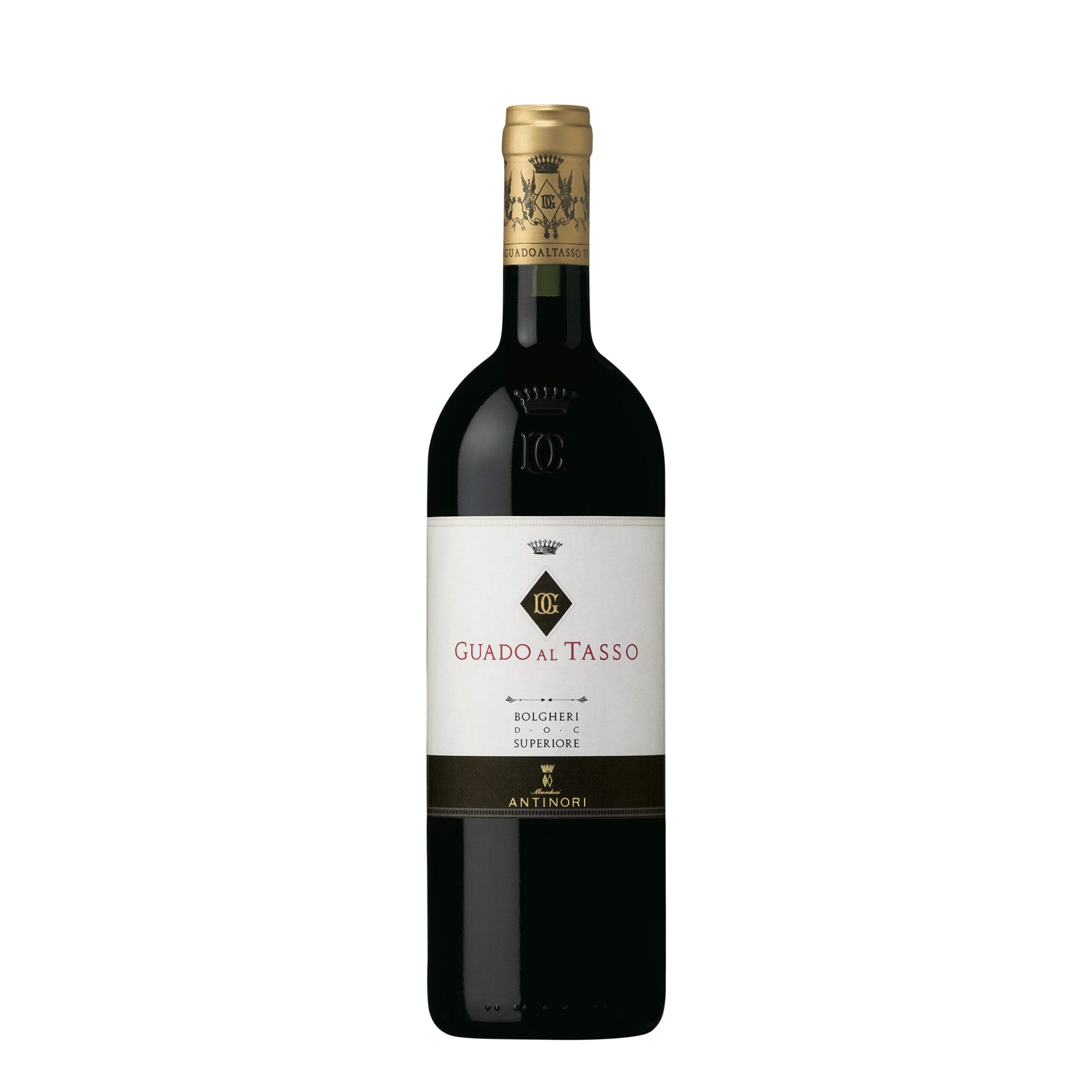 Guado al Tasso presenta in etichetta lo stemma della famiglia Della Gherardesca con le sue iniziali, DG, antica proprietaria della tenuta.